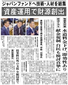 自民を除けば他の野党は殆ど「消費税減税」に賛成している。特筆すべきは「中道」だけが、消費税の食品だけをゼロにするための、約5~6兆円といわれている財源を明示している。政府系の活用されていない財源を「ジャパンファンド」という政府系のファンドを創設して、このファンドの活用利益の一部を減税に充当しようという案である。